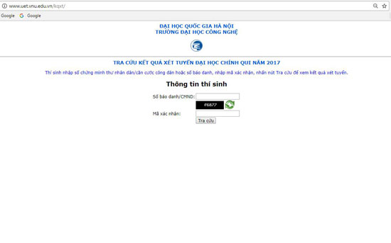 Với ĐH Công nghệ - ĐH Quốc gia Hà Nội, các thí sinh có thể theo dõi kết quả xét tuyển đại học chính quy năm 2017 vào các ngành đào tạo của trường tại website: website: http://www.uet.vnu.edu.vn/kqxt. Thí sinh nhập sinh nhập số chứng minh thư nhân dân/căn cước công dân hoặc số báo danh, nhập mã xác nhận và nhấn nút Tra cứu để xem kết quả xét tuyển.