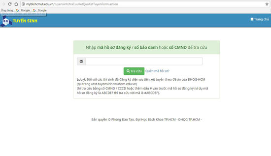 Giao diện trang hỗ trợ tra cứu kết quả xét tuyển đại học chính quy 2017 của ĐH Bách khoa TP.HCM - ĐH Quốc gia TP.HCM.