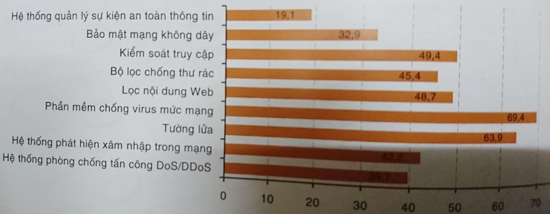 Tỉ lệ tổ chức sử dụng công nghệ, biện pháp kỹ thuật để bảo vệ hệ thống mạng (phân chia theo các công nghệ, biện pháp kỹ thuật) năm 2016 (Nguồn: Sách Trắng CNTT-TT Việt Nam 2017) |
