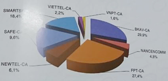 Về thị phần dịch vụ chứng thư số công cộng, trong số 8 doanh nghiệp triển khai kinh doanh dịch vụ này, năm 2016 thị phần của BKAV-CA vẫn lớn nhất, chiếm 29,9%; tiếp đó là FPT-CA, chiếm 27,4%; SMARTSIGN chiếm 18,4%; SAFE-CA chiếm 9,6%; NEWTEL-CA chiếm 6,1%; NACENCOMM chiếm 4,8%; VIETTEL-CA chiếm 2,2%; và VNPT-CA chiếm 1,6%.