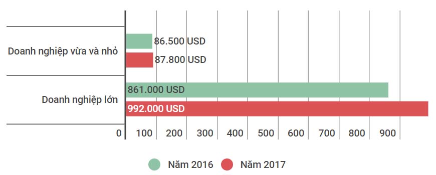 Đây là một mối quan ngại đối với các doanh nghiệp bởi sự cố bảo mật không hề tốn ít chi phí hơn để phục hồi. Năm 2017, các doanh nghiệp vừa và nhỏ đã chi trả trung bình 87.800 USD cho mỗi sự cố bảo mật (so với 86.500 USD năm 2016). Trong khi đó, các doanh nghiệp lớn phải đối mặt với mức 992.000 USD cho một sự cố vào năm 2017 so với mức 861.000 USD vào năm 2016.