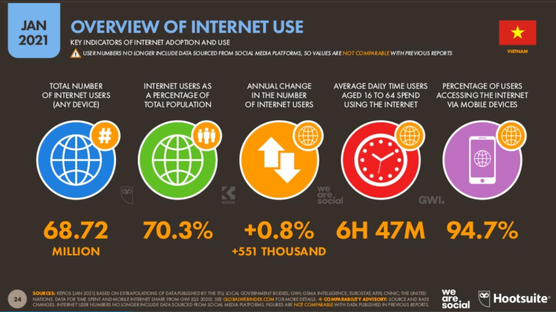 Tuy mới được hòa mạng Internet toàn cầu vào năm 1997, chỉ sau hơn 20 năm phát triển, đến nay Việt Nam đã thuộc top đầu các nước "có tương tác cao với Internet", là một trong 20 quốc gia "năng động nhất về Internet". Theo báo cáo toàn cảnh Digital Việt Nam của We Are Social và Hootsuite, đến tháng 1/2021, số người dùng Internet tại Việt Nam là 68,72 triệu người, chiếm 70.3% dân số; số người dùng mạng xã hội là 72 triệu, chiếm 73.7% dân số.