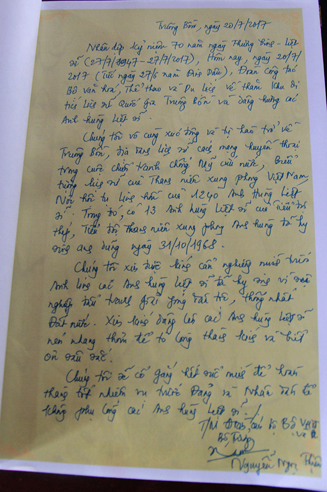 Tại Khu Di tích lịch sử Truông Bồn, Bộ trưởng Nguyễn Ngọc Thiện cùng đoàn công tác đã dâng hương tưởng niệm 13 anh hùng Liệt sỹ thanh niên xung phong và hơn 1.240 anh hùng Liệt sỹ đã hy sinh xương máu bảo vệ Tổ quốc.