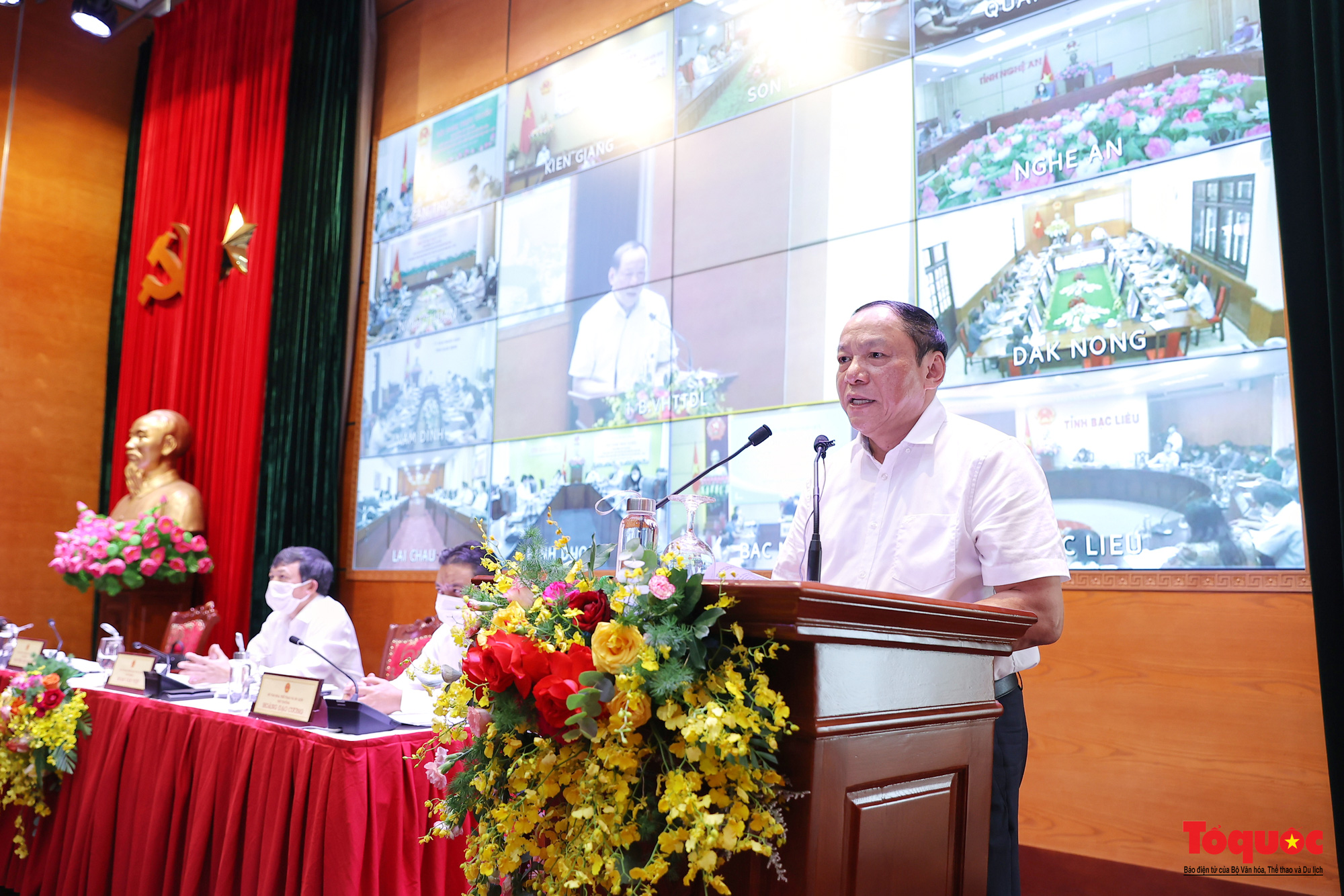Hội nghị diễn ra dưới hình thức trực tuyến với các điểm cầu tại trụ sở UBND 63 tỉnh, thành phố trực thuộc Trung ương. Điểm cầu Bộ VHTTDL có sự tham dự và chủ trì của Ủy viên BCH Trung ương Đảng, Bộ trưởng Bộ VHTTDL Nguyễn Văn Hùng; Thứ trưởng Tạ Quang Đông; Thứ trưởng Đoàn Văn Việt; Thứ trưởng Hoàng Đạo Cương.