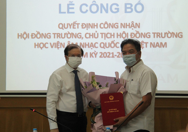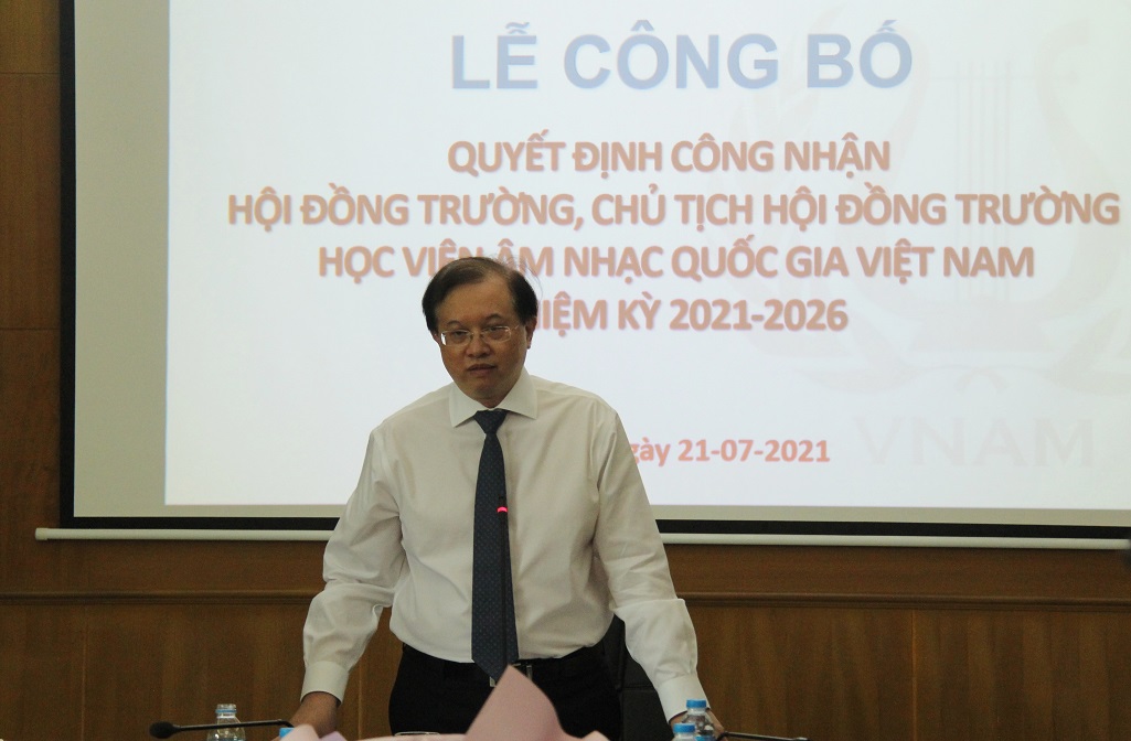 (TTCNTT) - Sáng 21/7, tại Hà Nội, Học viện Âm nhạc Quốc gia Việt Nam đã tổ chức Lễ công bố Quyết định công nhận Hội đồng trường, Chủ tịch Hội đồng trường nhiệm kỳ 2021 - 2026. Thứ trưởng Bộ Văn hóa, Thể thao và Du lịch (VHTTDL) Tạ Quang Đông đã đến dự vào trao quyết định.