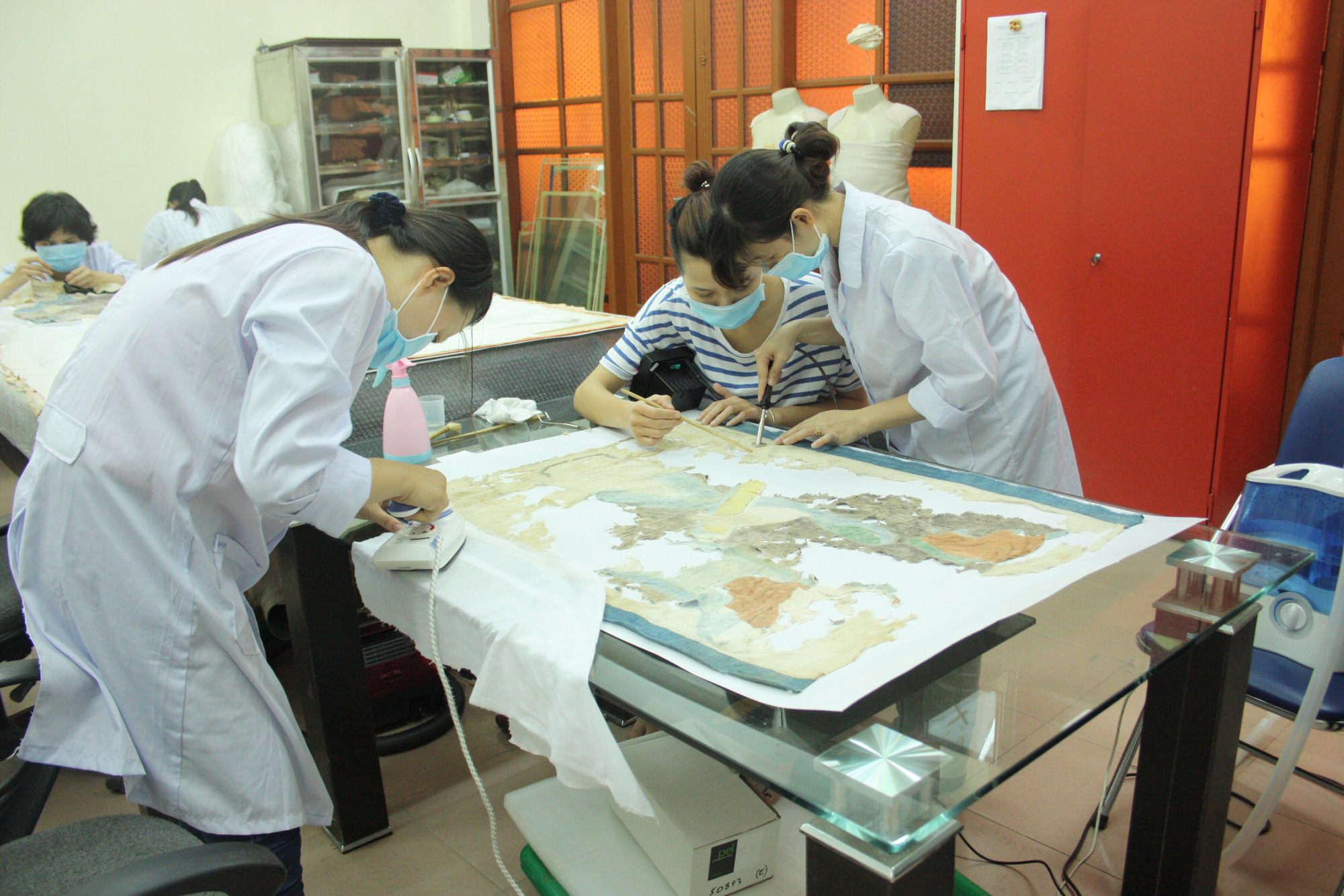 Cán bộ BTLSQG đang tu bổ, phục dựng tranh lụa