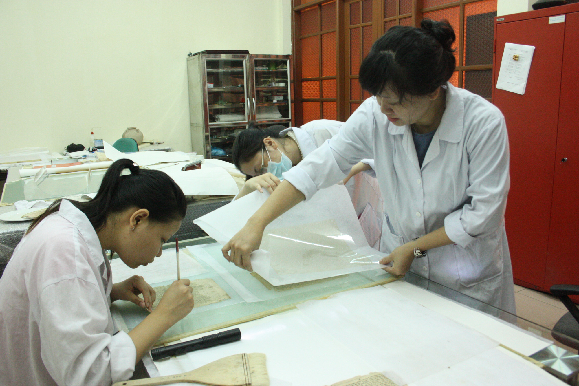 Cán bộ BTLSQG đang tu bổ bảo quản hiện vật chất liệu giấy