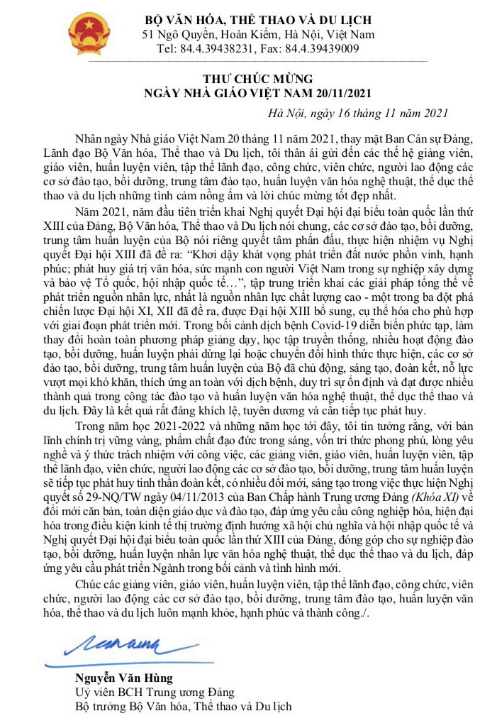 (TTCNTT) - Nhân ngày Nhà giáo Việt Nam 20 tháng 11 năm 2021, thay mặt Ban Cán sự Đảng, Lãnh đạo Bộ Văn hóa, Thể thao và Du lịch, Ủy viên Ban Chấp hành Trung ương Đảng, Bộ trưởng Bộ Văn hóa, Thể thao và Du lịch đã gửi đến các thế hệ giảng viên, giáo viên, huấn luyện viên, tập thể lãnh đạo, công chức, viên chức, người lao động các cơ sở đào tạo, bồi dưỡng, trung tâm đào tạo, huấn luyện văn hóa nghệ thuật, thể dục thể thao và du lịch những tình cảm nồng ấm và lời chúc mừng tốt đẹp nhất.