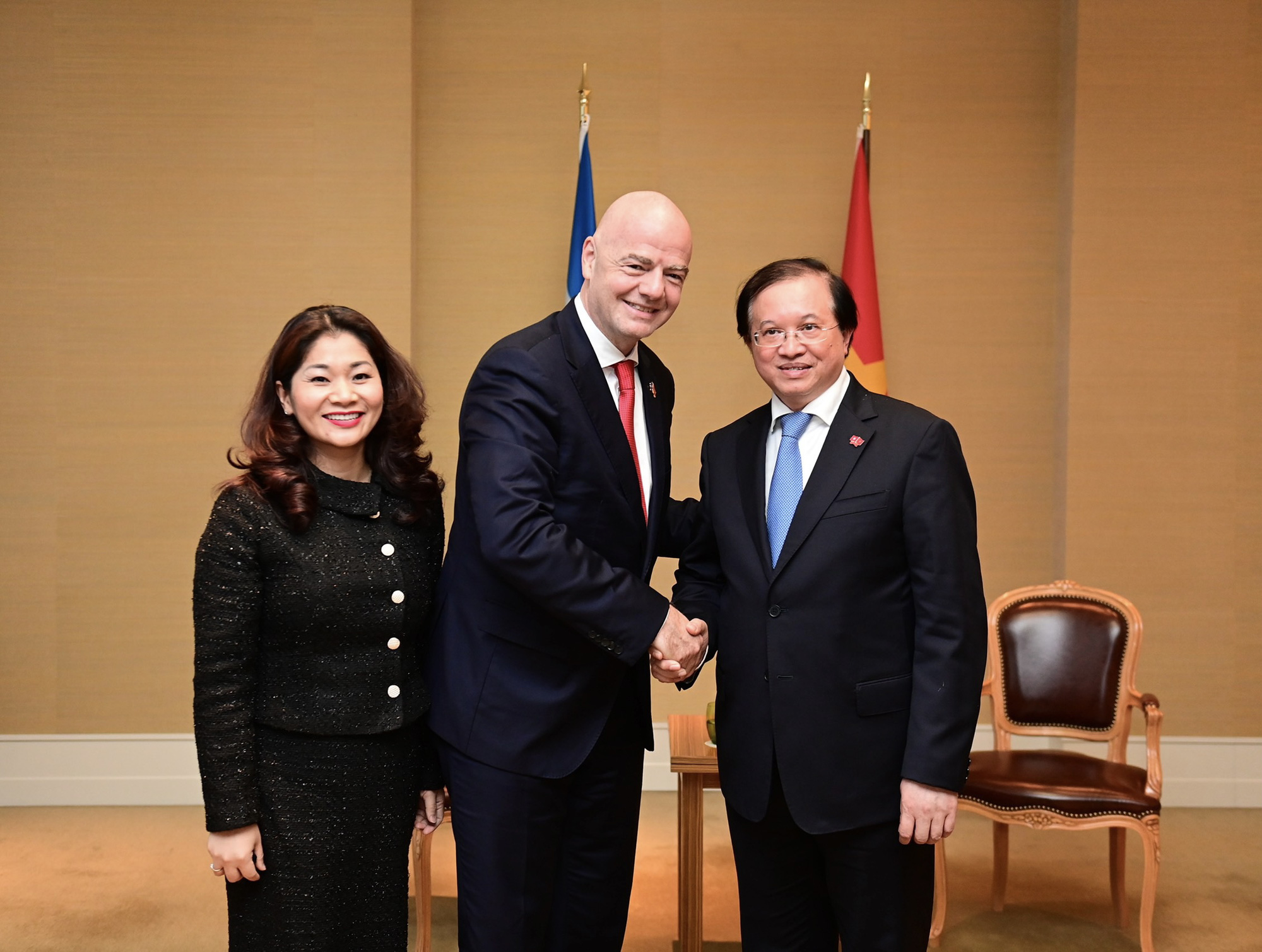 Chủ tịch FIFA Gianni Infantino và Thứ trưởng Bộ VHTTDL Tạ Quang Đông, Cục trưởng Cục Hợp tác quốc tế (Bộ VHTTDL) Nguyễn Phương Hòa