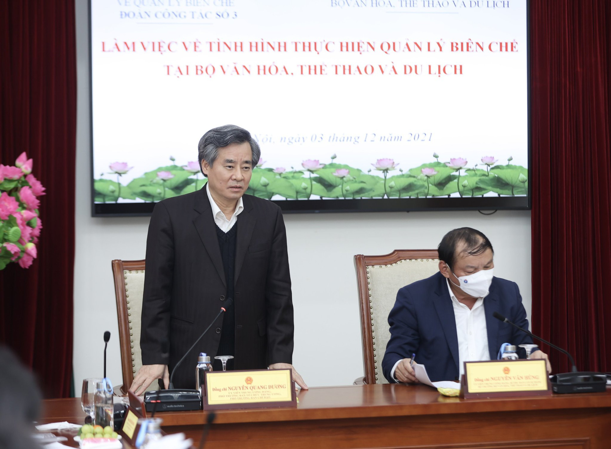 Ông Nguyễn Quang Dương cũng đánh giá cao chỉ đạo thiết thực, quyết liệt của Bộ và Ban cán sự Đảng Bộ VHTTDL đã thể chế hóa các văn bản, cùng với đó là sự phối hợp, công khai sắp xếp tổ chức, làm sớm và hoàn thành hệ thống bản mô tả và khung năng lực vị trí việc làm của các đơn vị hành chính và sự nghiệp… đã góp phần thực hiện tốt việc quản lý biên chế. Đồng thời, tiếp thu những đề xuất, kiến nghị có tính đặc thù của ngành VHTTDL về công tác quản lý biên chế để báo cáo cấp có thẩm quyền và giao cơ quan chức năng nghiên cứu, làm cơ sở ban hành chính sách phù hợp thực tiễn với Bộ VHTTDL trong công tác quản lý biên chế giai đoạn tiếp theo. Đoàn cũng đề nghị Bộ VHTTDL hoàn thiện báo cáo trên cơ sở phân tích, đánh giá rõ hơn những kết quả, tính đặc thù, kinh nghiệm, khó khăn, bất cập trong công tác quản lý biên chế của Bộ gửi về BCĐ Trung ương.