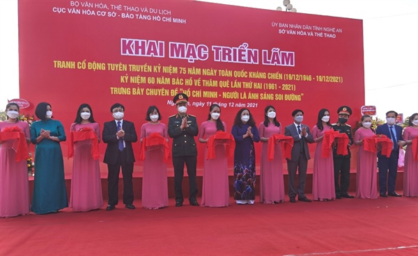 (TTCNTT) - Chiều 11.12.2021 tại Quảng trường Hồ Chí Minh, TP. Vinh, tỉnh Nghệ An, Cục Văn hóa cơ sở, Bảo tàng Hồ Chí Minh phối hợp với Sở VH&TT tỉnh Nghệ An đã tổ chức khai mạc triển lãm tranh cổ động tấm lớn tuyên truyền kỷ niệm 75 năm Ngày Toàn quốc kháng chiến (19.12.1946-19.12.2021); 60 năm ngày Bác Hồ về thăm quê lần thứ hai (8.12.1961- 8.12.2021) và trưng bày chuyên đề Hồ Chí Minh - Người là ánh sáng soi đường.