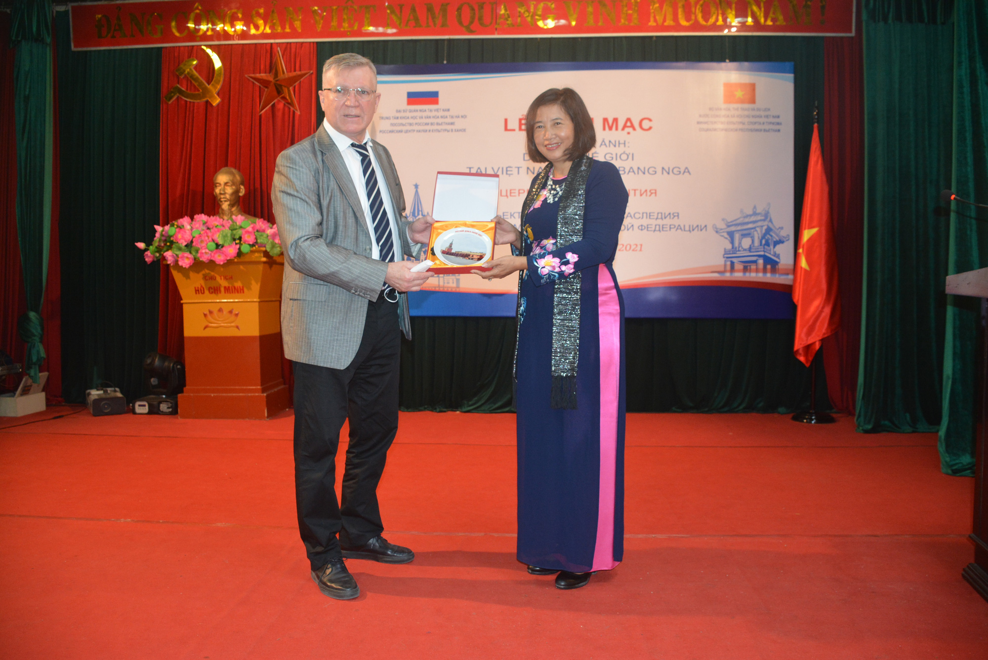 Ông Victor Vasilievich Stepanov – Bí thư thứ nhất Đại sứ quán Nga tại Việt Nam; Giám đốc Trung tâm Khoa học và Văn hóa Nga tại Hà Nội trao tặng quà lưu niệm cho Bảo tàng Văn hóa các dân tộc Việt Nam nhân dịp triển lãm ảnh "Di sản thế giới tại Việt Nam và Liên bang Nga" tại Bảo tàng Văn hóa các dân tộc Việt Nam