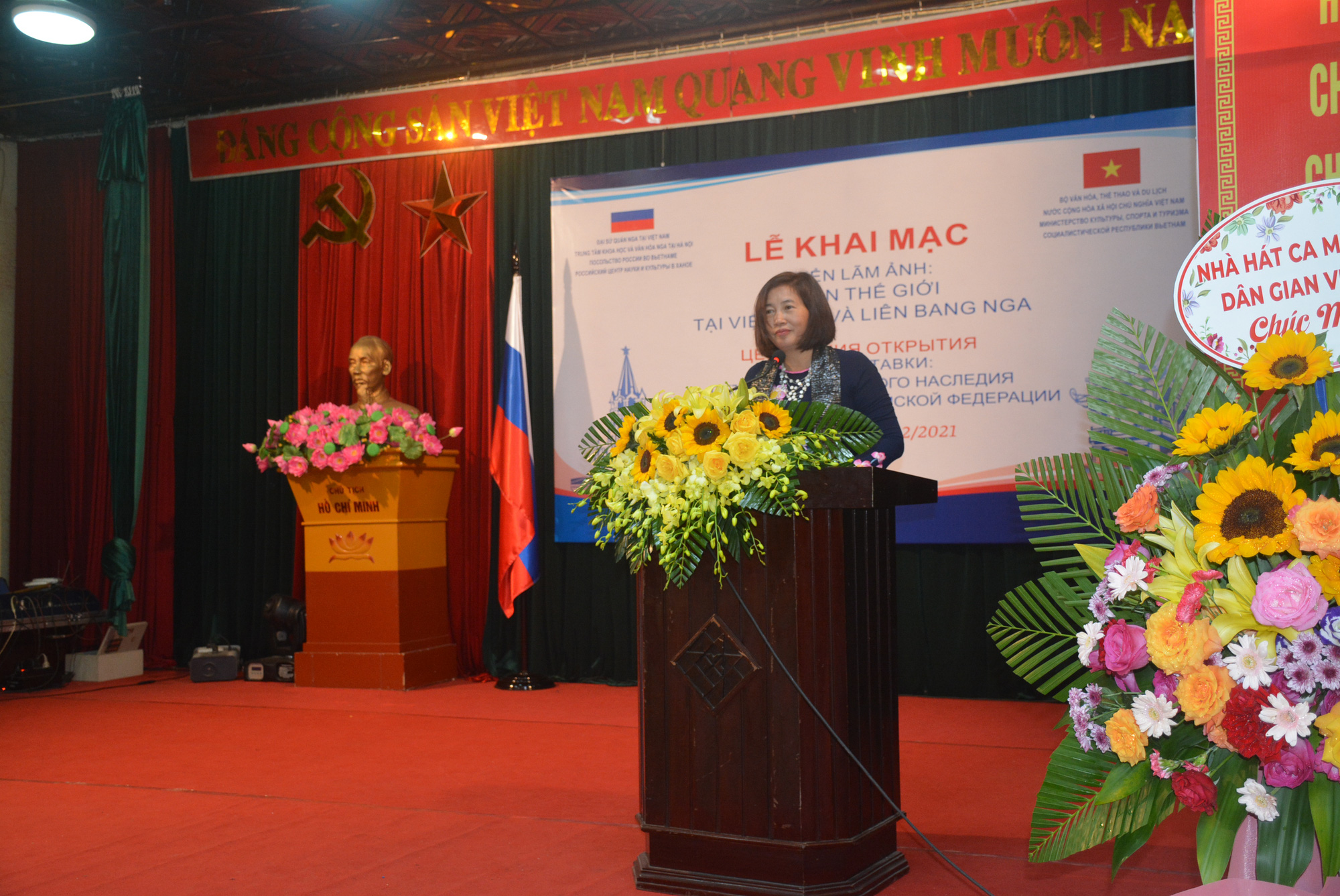 TS. Nguyễn Thị Ngân, Giám đốc Bảo tàng Văn hóa các dân tộc Việt Nam đọc diễn văn khai mạc Triển lãm ảnh "Di sản thế giới tại Việt Nam và Liên bang Nga"