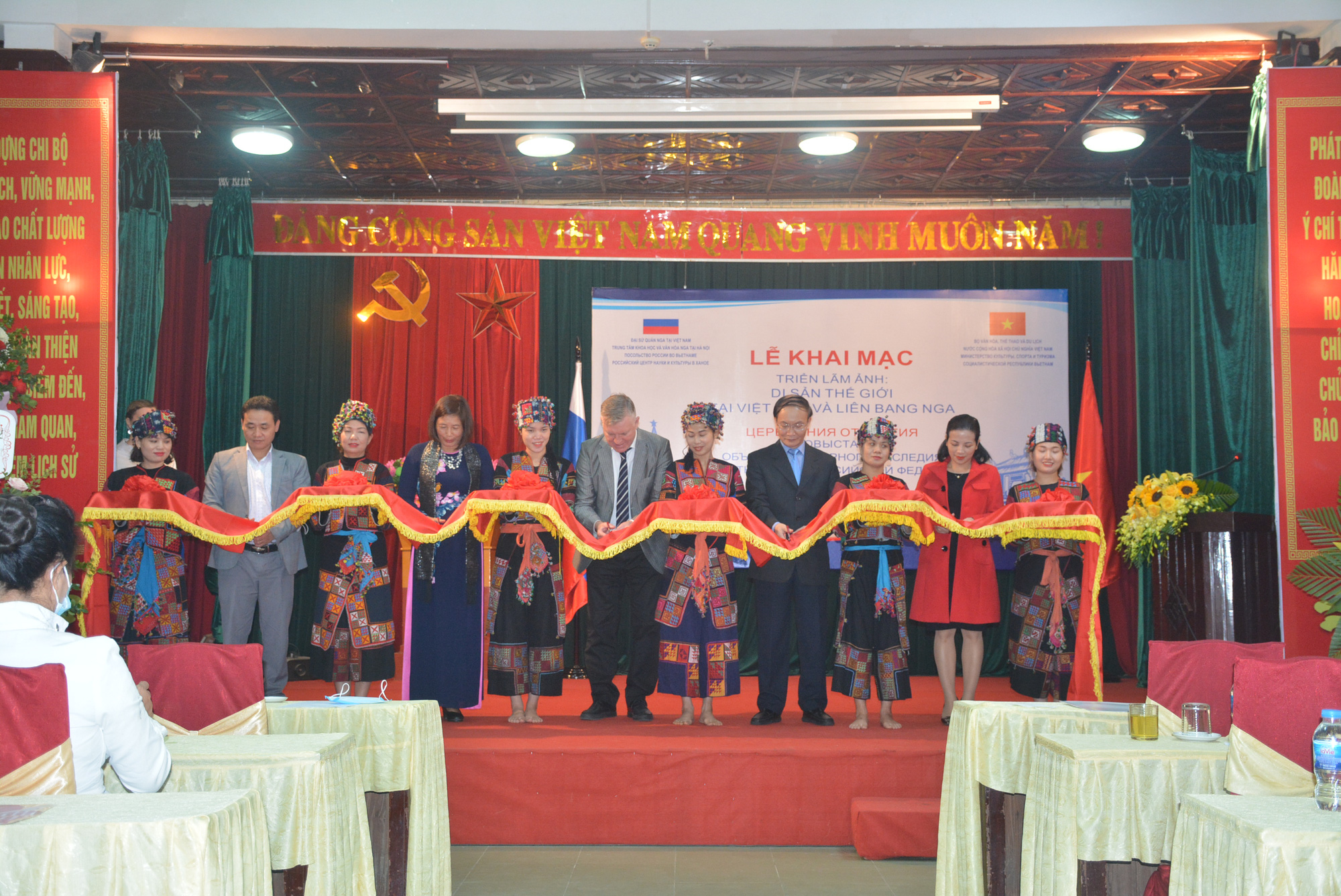 Các đại biểu cắt băng khai mạc Triển lãm ảnh "Di sản thế giới tại Việt Nam và Liên bang Nga" tại Bảo tàng Văn hóa các dân tộc Việt Nam