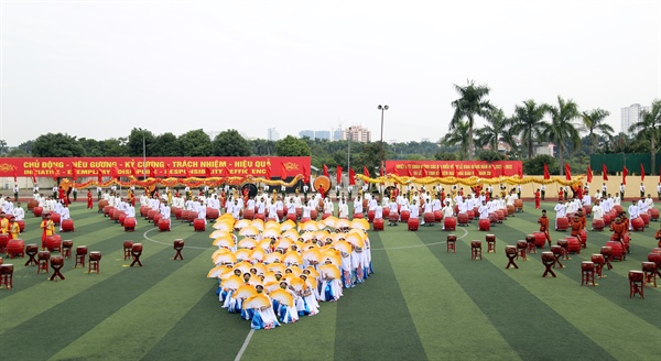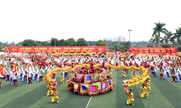 Đoàn Nghệ thuật trống hội của Học viện Cảnh sát nhân dân tập dượt tiết mục “Hào khí non sông”.